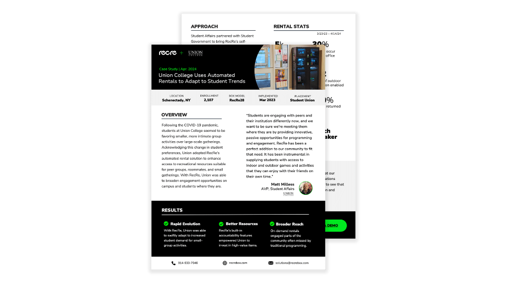 Submit the form to discover how Union College used RecRe to adapt to changing student interests, optimize student union space usage, and ensure rental accountability. Plus, gain exclusive access to invaluable rental data insights, including: peak activity days, amount of peer interaction enabled, tech usage rates, and student savings.